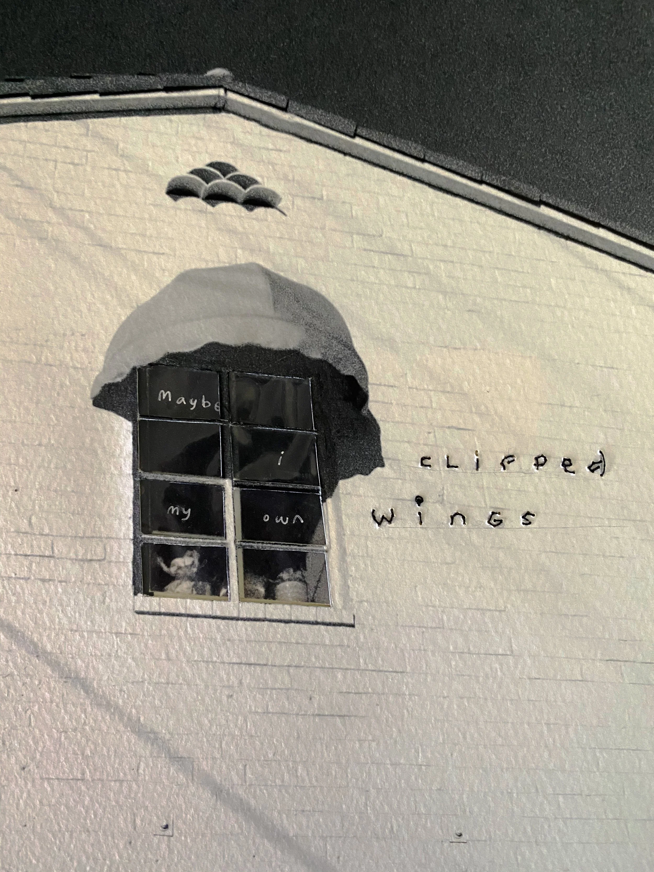 Another striking work is a photograph of a seemingly inviting, cookie-cutter American home, adorned with a handwritten note on the window that reads, “Everything is going to be O.K.” The zoomed-in perspective and precise framing create an almost off-putting tension, prompting the viewer to question: Is that really so?